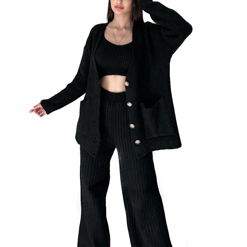 European And American Style Solid Color Sweater Button Cardigan Vest Pants Three-piece Set