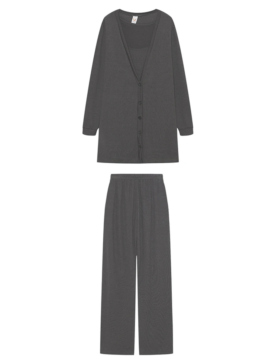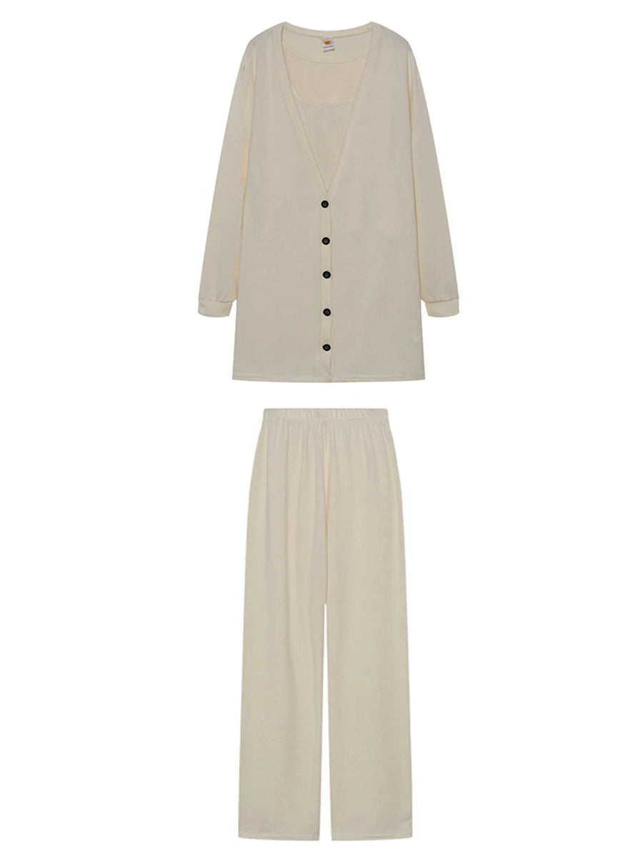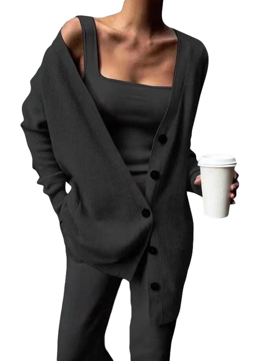 Scriardv Women Autumn Loose Three Piece Outfits Fitted Cami Tops Long Pants V Neck Button Cardigan Loungewear Sets (Black M)